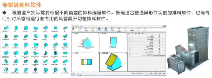 各種工業(yè)異形件加工;各種通風(fēng)管道彎頭切割加工(配合專用的風(fēng)管選型與編程軟件,輕松實現(xiàn)風(fēng)管切割加工),各種薄板金屬制品的切割加工(如:不銹鋼廚具、炊具),廣泛應(yīng)用于各個行業(yè)的金屬薄板切割加工。